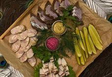 450 г • Сало, колбаса домашняя, бутерброды с сельдью, огурцы маринованные, хрен или горчица на выбор