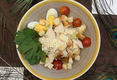 200 г • Куриное филе, томаты Черри, сыр Пармезан, яйцо, сухари, салат Айсберг, соус Цезарь